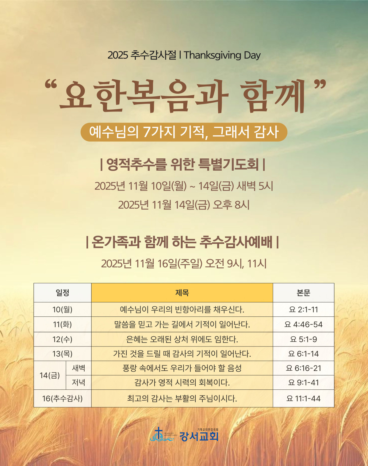 추수의 계절, 우리에게 베풀어주신 하나님의 은혜를 돌아보면서 강서교회 식구들과 함께 11월 10~14일에는 영적추수를 위한 특별기도회, 그리고 11월 16일 주일에는 온가족과 함께하는 추수감사예배의 시간을 가졌습니다. 또한, 16일 오후 시간에는 '전교인 요한복음 성경퀴즈대회'도 진행하였으며, 이후 강단을 장식했던 과일들을 장애인복지센터 '샬롬의 집'에 기증하였습니다. 주 안에서 아름다운 교제와 사랑을 나누며 기쁨과 감사의 고백을 올려드린 귀한 시간이었습니다. |